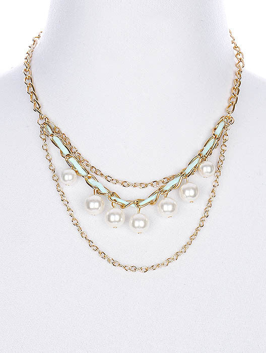 NECKLACE / PEARL FRINGE / THREE LAYER BIB / METAL SETTING / INTERLACED FELT STRAND / LINK / CHAIN / 18 INCH LONG / 1 1/2 INCH DROP / NICKEL AND LEAD COMPLIANT