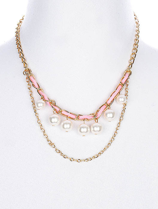 NECKLACE / PEARL FRINGE / THREE LAYER BIB / METAL SETTING / INTERLACED FELT STRAND / LINK / CHAIN / 18 INCH LONG / 1 1/2 INCH DROP / NICKEL AND LEAD COMPLIANT