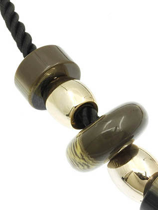 NECKLACE / CHUNKY METALLIC BEAD / LUCITE STONE BIB / MARBLE FINISH / ROPE CORD / 18 INCH LONG / 1 1/4 INCH DROP / NICKEL AND LEAD COMPLIANT