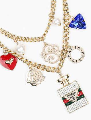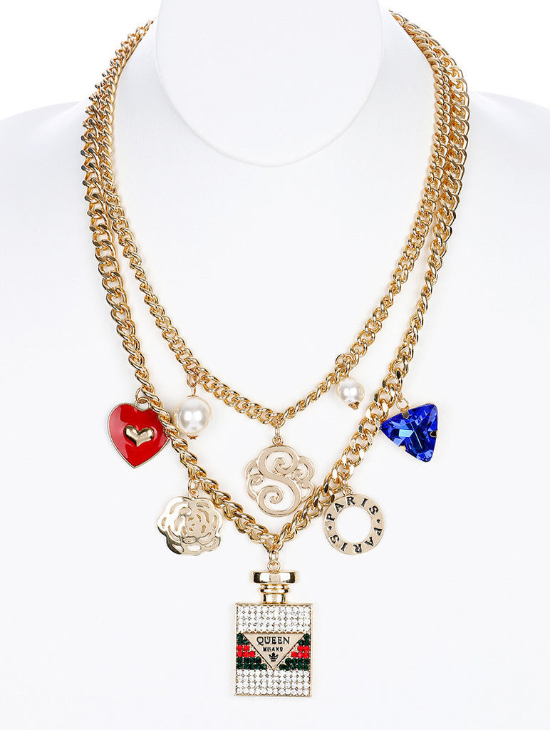 NECKLACE / DOUBLE LAYERED CHARM / CHUNKY METAL CHAIN / PERFUME BOTTLE / PAVE CRYSTAL STONE / TRILLION FACETED LUCITE / PEARL / HEART / ROSE / CUTOUT / EPOXY COAT / LINK / CURB CHAIN / 16 INCH LONG / 4 1/2 INCH DROP / NICKEL AND LEAD COMPLIANT