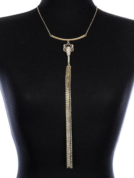 NECKLACE / METAL SCORPION / CHAIN TASSEL / CRYTAL STONE / TEXTURED / METAL ROD / LINK / 16 INCH LONG / 10 INCH DROP / NICKEL AND LEAD COMPLIANT