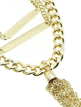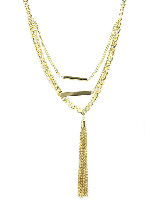 NECKLACE / THREE LAYER / CHAIN TASSEL / METAL ROD / LINK / 16 INCH LONG / 6 1/4 INCH DROP / NICKEL AND LEAD COMPLIANT