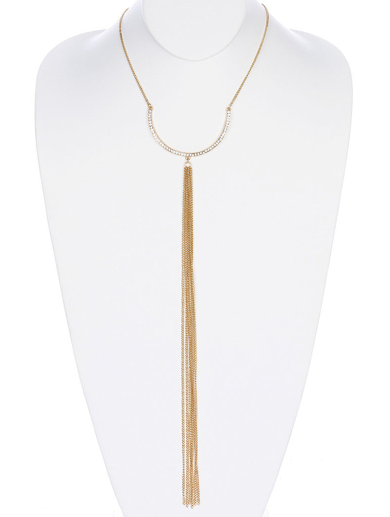 NECKLACE / METAL ARC / LONG CHAIN TASSEL / PAVE CRYSTAL STONE / LINK / CHAIN / 18 INCH LONG / 12 INCH DROP / NICKEL AND LEAD COMPLIANT