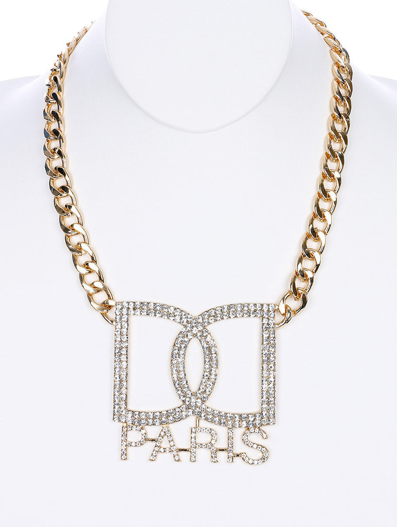NECKLACE / PAVE CRYSTAL STONE / CHUNKY METAL BIB / MESSAGE / PARIS / LINK / CURB CHAIN / 14 INCH LONG / 3 INCH DROP / NICKEL AND LEAD COMPLIANT