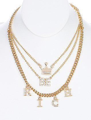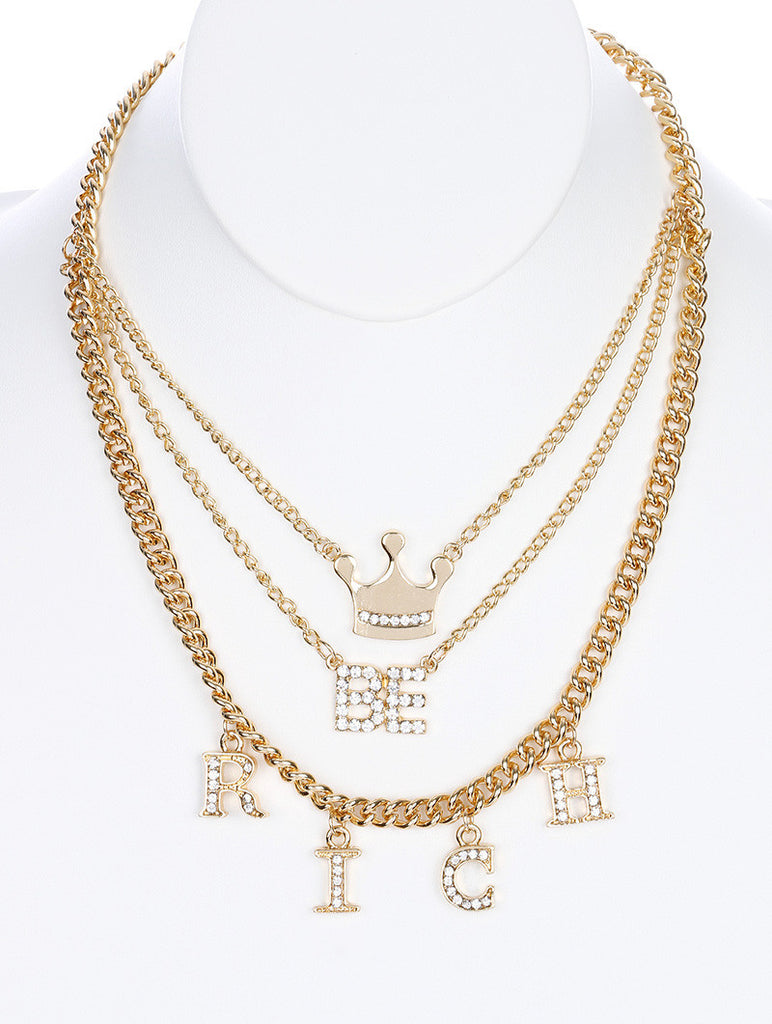 NECKLACE / METAL CROWN CHARM / THREE LAYER CHAIN / MESSAGE / BE RICH / PAVE CRYSTAL STONE / LINK / CHAIN / 16 INCH LONG / 3 INCH DROP / NICKEL AND LEAD COMPLIANT