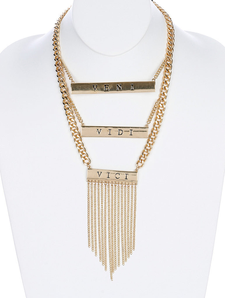 NECKLACE / MESSAGE METAL BAR / THREE LAYER CHAIN / VENI VIDI VICI / CHAIN FRINGE / LINK / CHAIN / 14 INCH LONG / 8 1/2 INCH DROP / NICKEL AND LEAD COMPLIANT