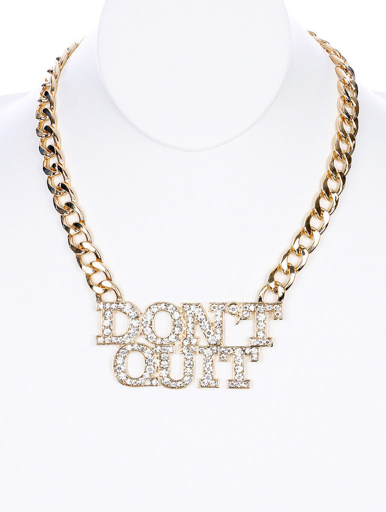 NECKLACE / PAVE CRYSTAL STONE / CHUNKY METAL BIB / MESSAGE / DONT QUIT / LINK / CURB CHAIN / 14 INCH LONG / 1 1/2 INCH DROP / NICKEL AND LEAD COMPLIANT