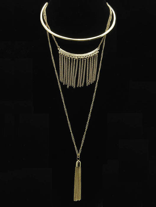NECKLACE / CHAIN TASSEL / METAL CHOKER / CHAIN FRINGE / THREE LAYER / 10 INCH LONG / 9 INCH DROP / NICKEL AND LEAD COMPLIANT