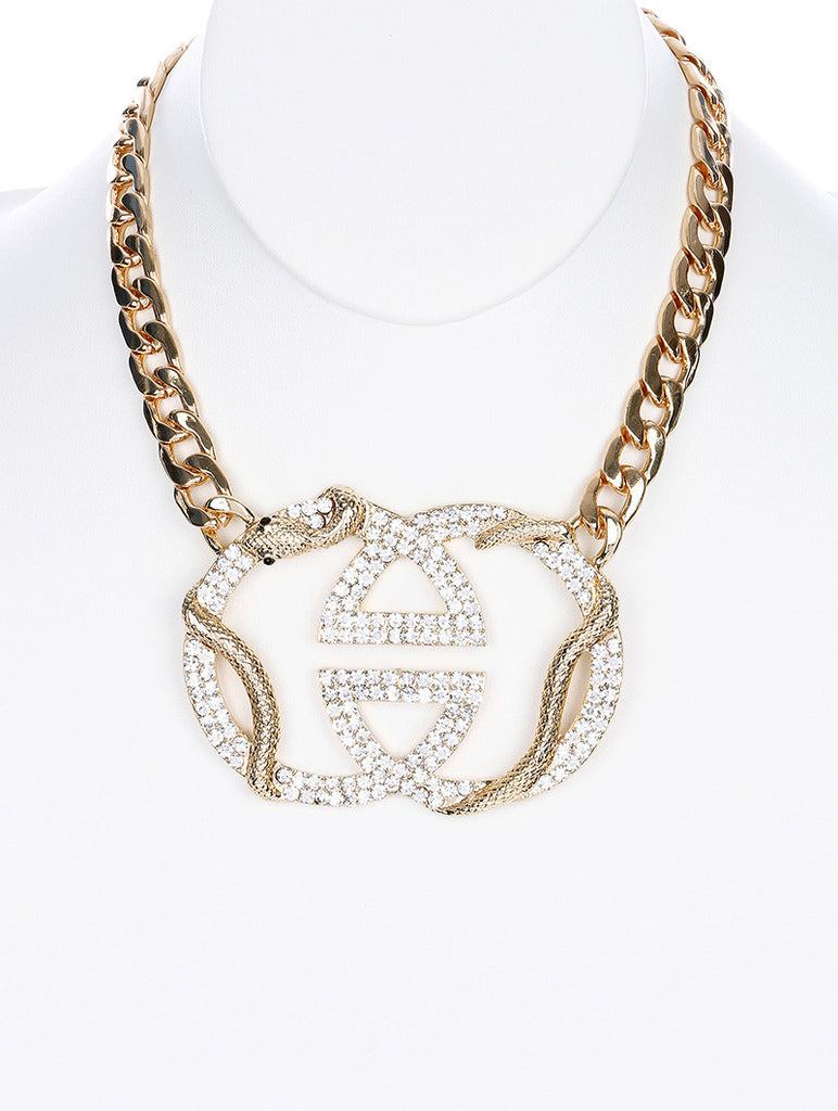NECKLACE / PAVE CRYSTAL STONE / CHUNKY METAL BIB / ETCHED SNAKE / LINK / CURB CHAIN / 14 INCH LONG / 2 1/2 INCH DROP / NICKEL AND LEAD COMPLIANT