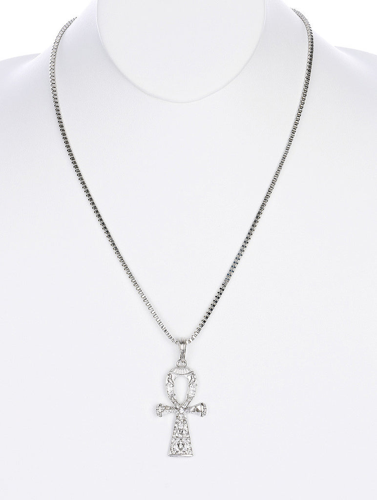 NECKLACE / METAL EGYPTIAN CROSS / PENDANT / ETCHED / CRYSTAL STONE / LINK / BOX CHAIN / 22 INCH LONG / 2 1/2 INCH DROP / NICKEL AND LEAD COMPLIANT