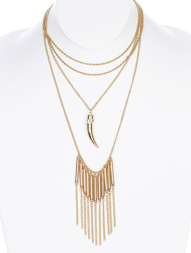 NECKLACE / ELEPHANT TUSK PENDANT / THREE LAYER CHAIN / METAL ROD FRINGE / PAVE CRYSTAL STONE / LINK / ROPE CHAIN / 16 INCH LONG / 7 INCH DROP / NICKEL AND LEAD COMPLIANT