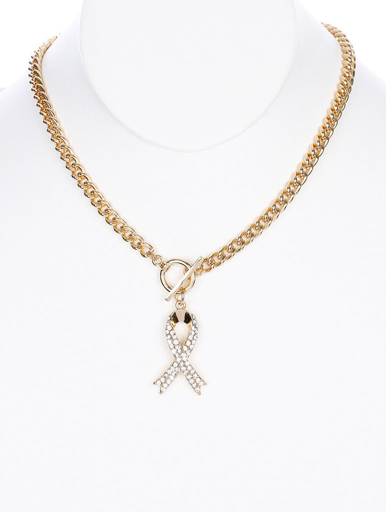 NECKLACE / PAVE CRYSTAL STONE / METAL RIBBON PENDANT / TOGGLE CLOSURE / LINK / CHAIN / 18 INCH LONG / 2 1/4 INCH DROP / NICKEL AND LEAD COMPLIANT