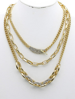 NECKLACE / THREE LAYER / CHUNKY CHAIN BIB / PAVE CRYSTAL STONE / LINK / CHAIN / 16 INCH LONG / 3 1/2 INCH DROP / NICKEL AND LEAD COMPLIANT