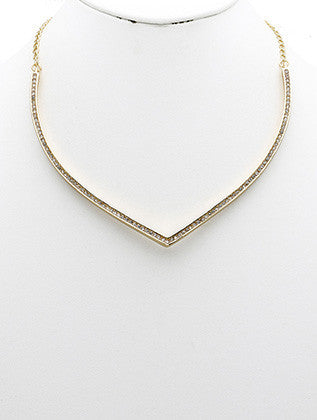NECKLACE / V SHAPE METAL / CHOKER / PAVE CRYSTAL STONE / 6 INCH DIAMETER / 1/8 INCH DROP / NICKEL AND LEAD COMPLIANT