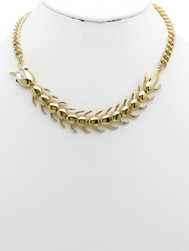 NECKLACE / SEGMENTED METAL CENTIPEDE / BIB / FACETED GLASS STONE / LINK / CHAIN / 14 INCH LONG / 3/4 INCH DROP / NICKEL AND LEAD COMPLIANT