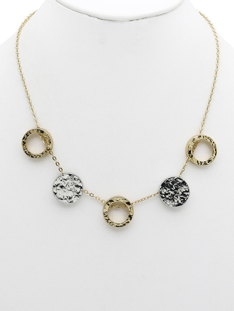NECKLACE / HAMMERED ROUND METAL / BIB / CUTOUT RING / TWO TONE / LINK / CHAIN / 16 INCH LONG / 3/4 INCH DROP / NICKEL AND LEAD COMPLIANT