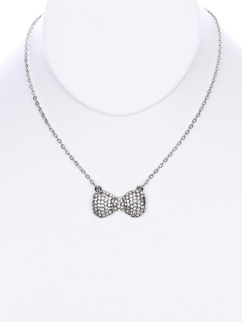 NECKLACE / PAVE CRYSTAL STONE / METAL BOW PENDANT / LINK / CHAIN / 16 INCH LONG / 1/2 INCH DROP / NICKEL AND LEAD COMPLIANT
