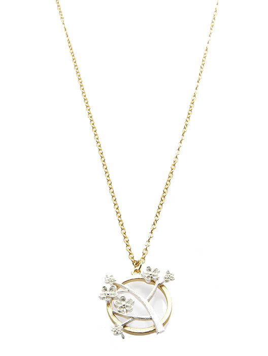 NECKLACE / CHERRY BLOSSOM / TWO TONE METAL PENDANT / TEXTURED / MATTE FINISH / LINK / CHAIN / 18 INCH LONG / 1 INCH DROP / NICKEL AND LEAD COMPLIANT