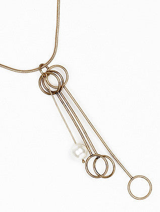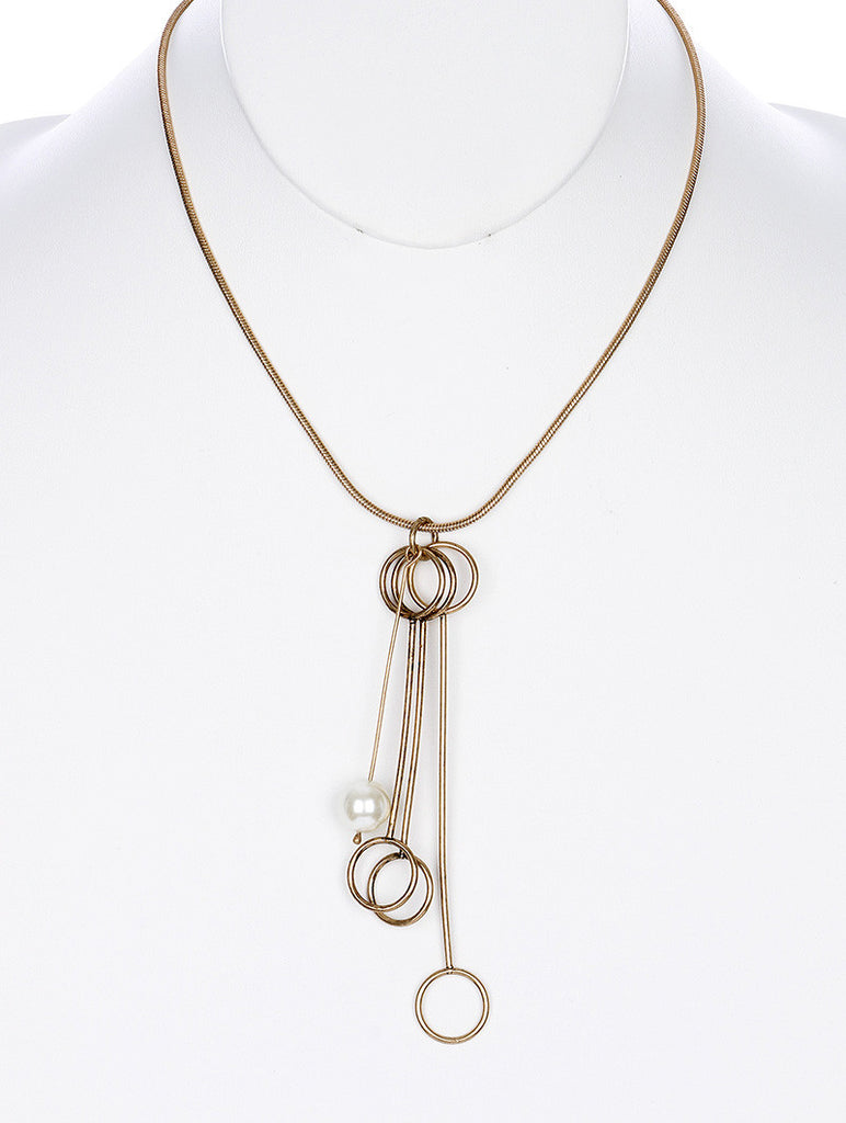 NECKLACE / DOUBLE METAL RING / PEARL CHARM / AGED FINISH / CHAIN / 16 INCH LONG / 4 1/4 INCH DROP / NICKLE AND LEAD COMPLIANT