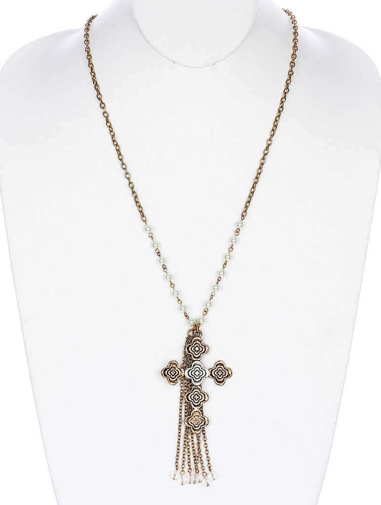 NECKLACE / CROSS PENDANT / CHAIN TASSEL / AGED FINISH METAL / HAMMERED / FLORAL PATTERN / TWO TONES / WHITE PEARL / GLASS BEADS / LINK / CHAIN / 30 INCH LONG / 4 1/4 INCH DROP / NICKLE AND LEAD COMPLIANT