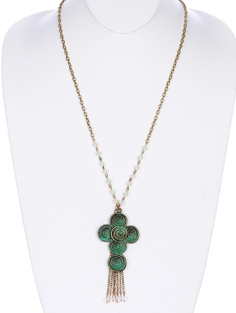 NECKLACE / CROSS PENDANT / CHAIN TASSEL / AGED FINISH METAL / HAMMERED / SPIRAL PATTERN / WHITE PEARL / GLASS BEADS / LINK / CHAIN / 30 INCH LONG / 4 1/4 INCH DROP / NICKLE AND LEAD COMPLIANT