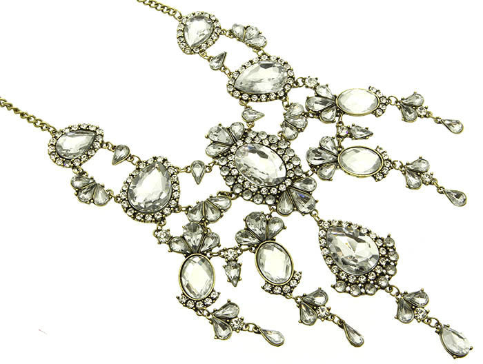 NECKLACE / TEAR DROP / CRYSTAL STONE / BURNISH / 5 INCH DROP / 16 INCH LONG / NICKEL AND LEAD COMPLIANT