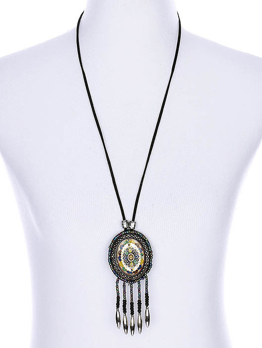 NECKLACE / MICRO BEAD / FAUX LEATHER / EPOXY / METAL BEAD / WOODEN BEAD / SUEDE ROPE / 4 3/4 INCH DROP / 28 INCH LONG / NICKEL AND LEAD COMPLIANT