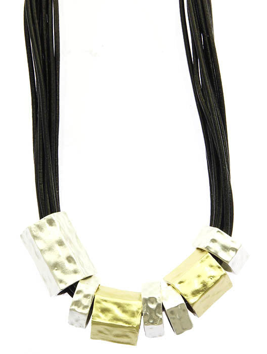 NECKLACE / MULTI STRAND / BIB / CHUNKY METAL BEAD / HAMMERED METAL / FAUX RUBBER CORD / 18 INCH LONG / 1 INCH DROP / NICKEL AND LEAD COMPLIANT
