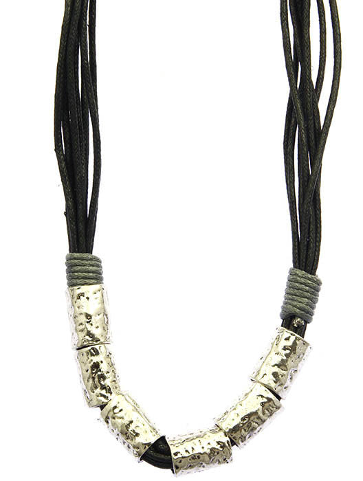 NECKLACE / MULTI STRAND / BIB / CHUNKY METAL BEAD / HAMMERED METAL / FAUX RUBBER CORD / 20 INCH LONG / 1/2 INCH DROP / NICKEL AND LEAD COMPLIANT