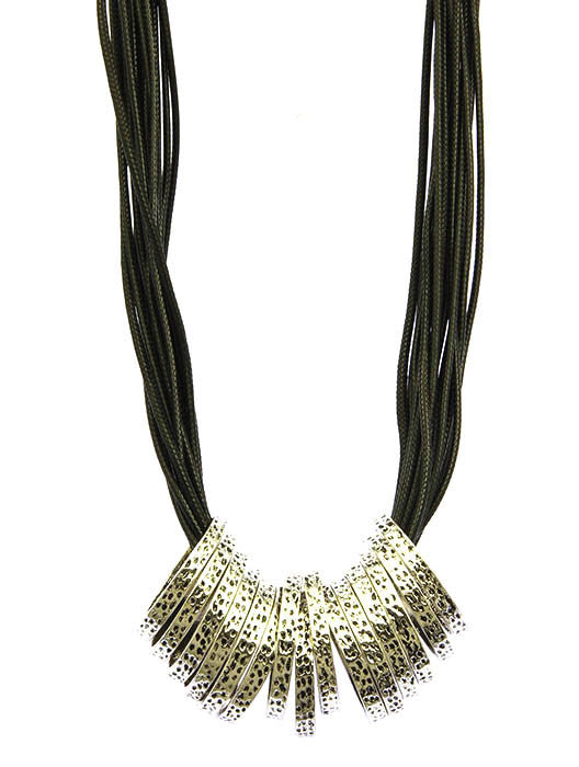 NECKLACE / MULTI STRAND / METAL RING / TEXTURED METAL / FAUX RUBBER CORD / 18 INCH LONG / 1 1/4 INCH DROP / NICKEL AND LEAD COMPLIANT