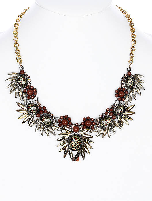 NECKLACE / LEOPARD PRINT / BIB / FLORAL LUCITE BEAD / HOMAICA / METALLIC FINISH / ROLO METAL CHAIN / 16 INCH LONG / 2 INCH DROP / NICKEL AND LEAD COMPLIANT