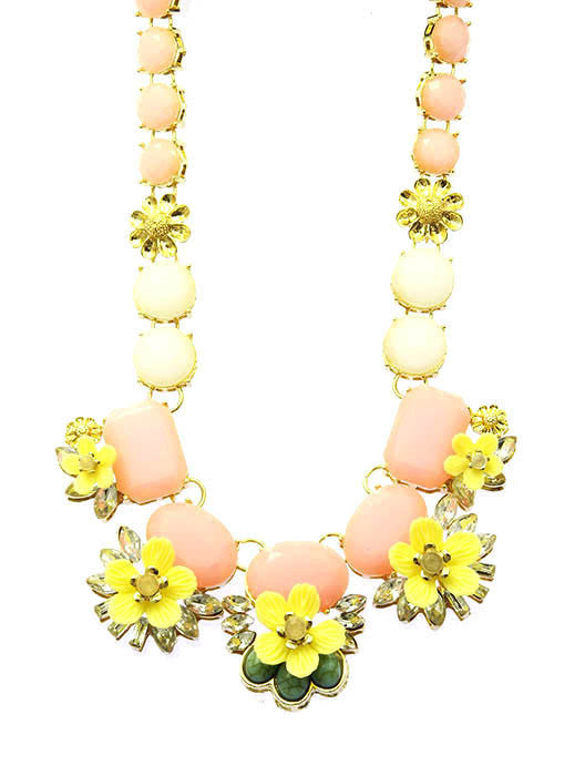 NECKLACE / FACETED HOMAICA BEAD / FLORAL / NATURAL STONE FINISH / LUCITE / GLASS STONE / TEXTURED METAL / METAL SETTING / 14 INCH LONG / 1 1/2 INCH DROP / NICKEL AND LEAD COMPLIANT